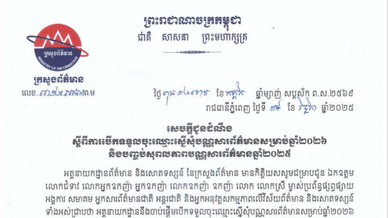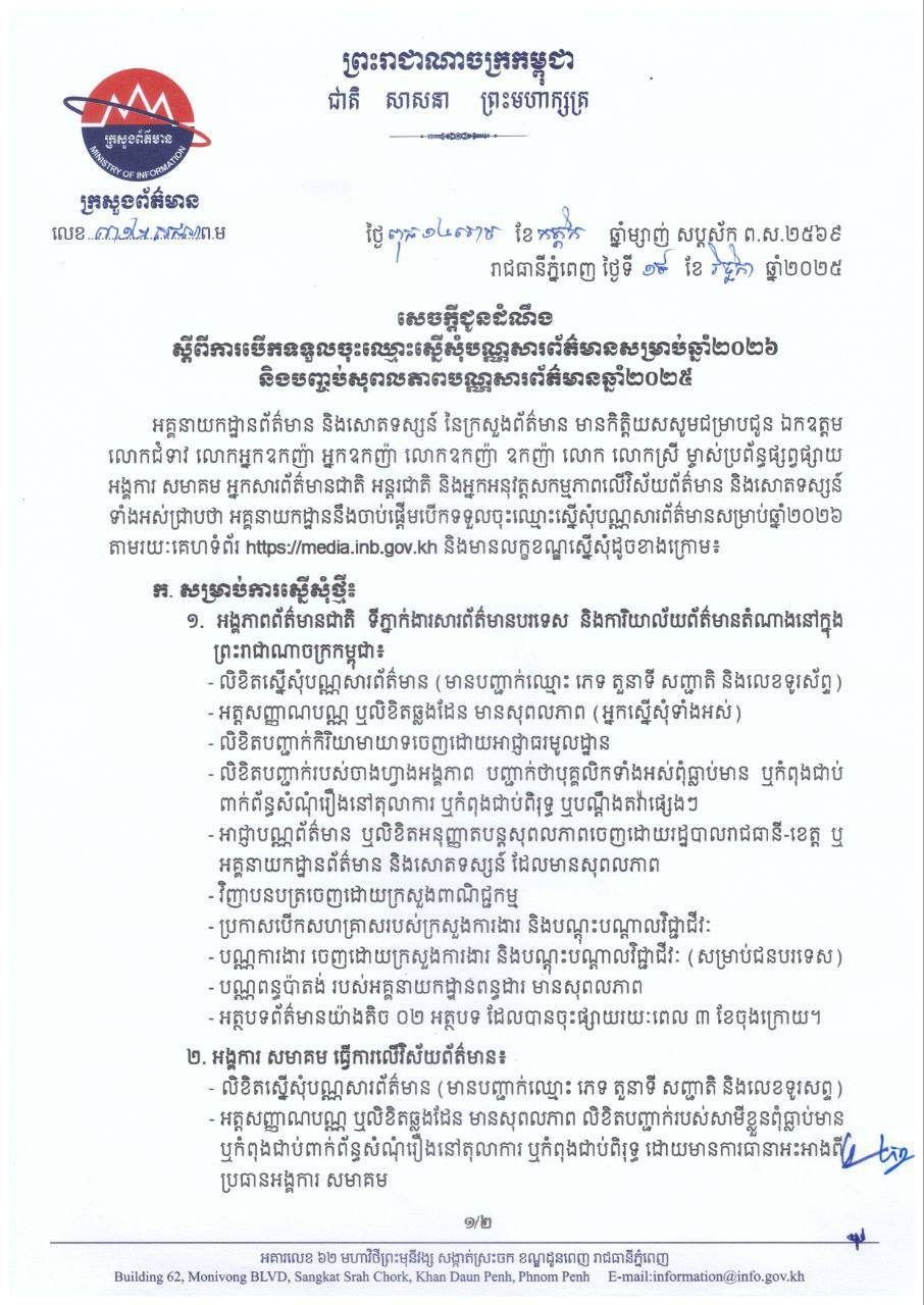 សេចក្តីជូនដំណឹងស្តីពីការបើកទទួលចុះឈ្មោះស្នើសុំបណ្ណសារព័ត៌មានសម្រាប់ឆ្នាំ២០២៦ និងបញ្ចប់សុពលភាពបណ្ណសារព័ត៌មានឆ្នាំ២០២៥
