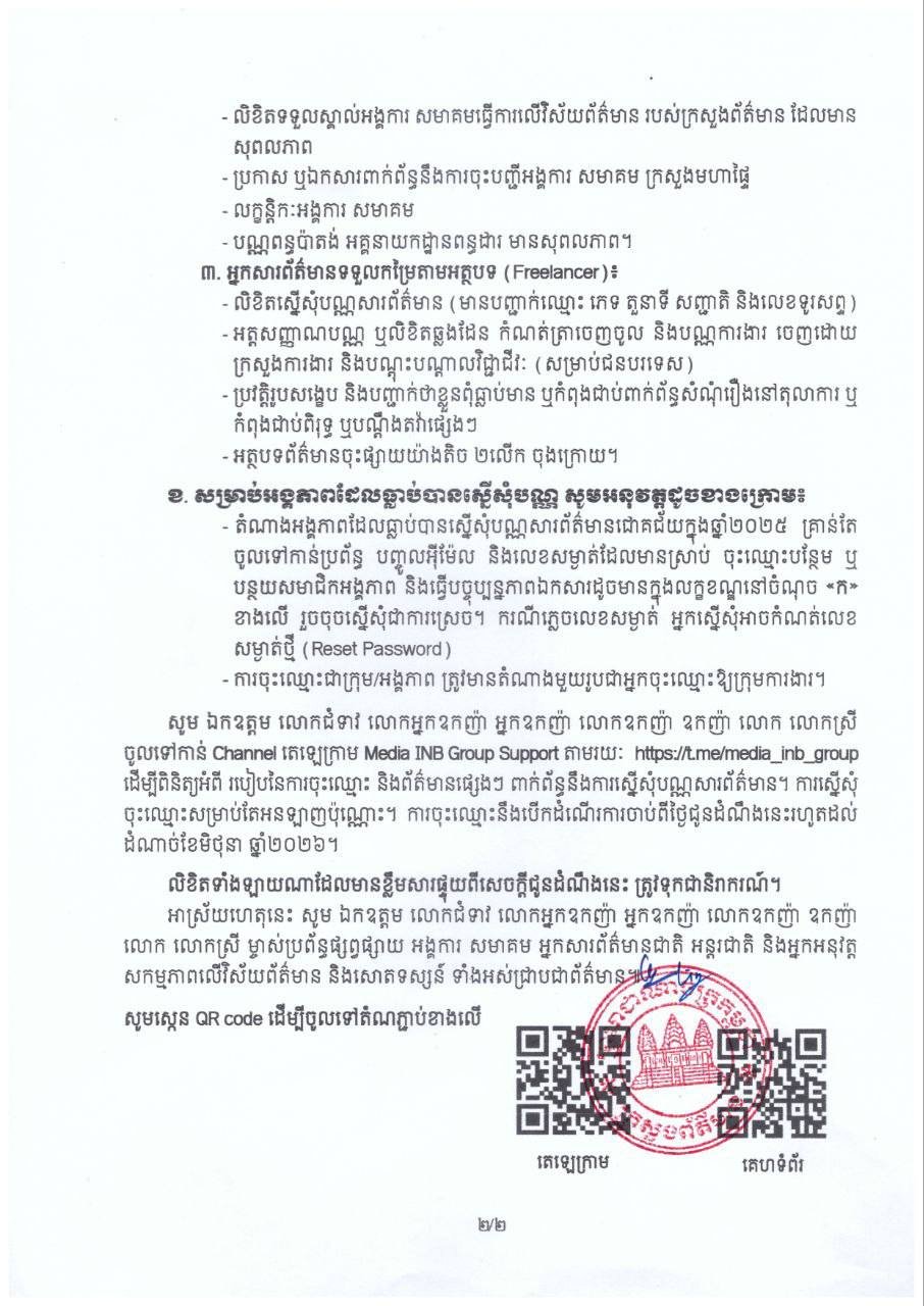 គេហទំព័រស្នើសុំចុះឈ្មោះ៖ https://media.inb.gov.kh