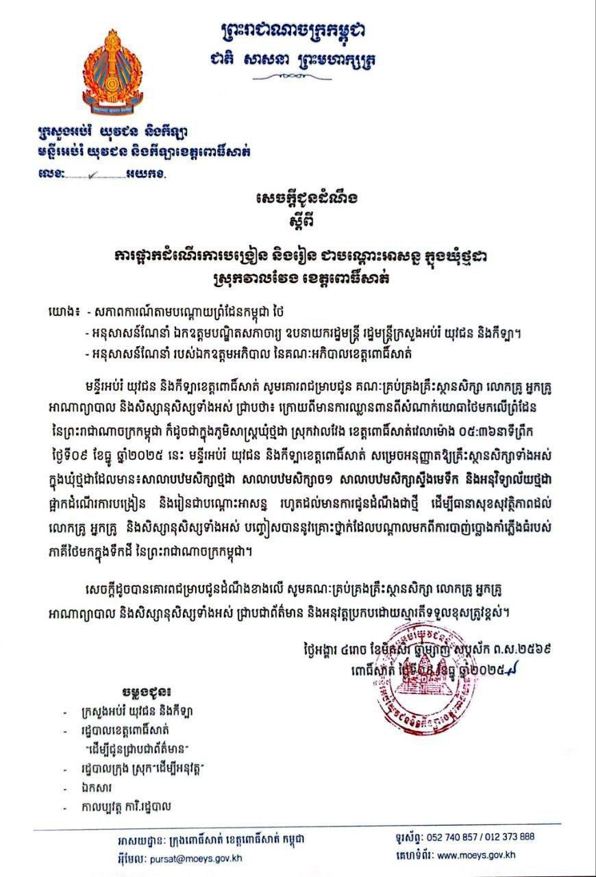 សេចក្តីជូនដំណឹង ស្តីពី ការផ្អាកដំណើរការបង្រៀន និងរៀន ជាបណ្តោះអាសន្ន ក្នុងឃុំថ្មដា ស្រុកវាលវែង ខេត្តពោធិ៍សាត់